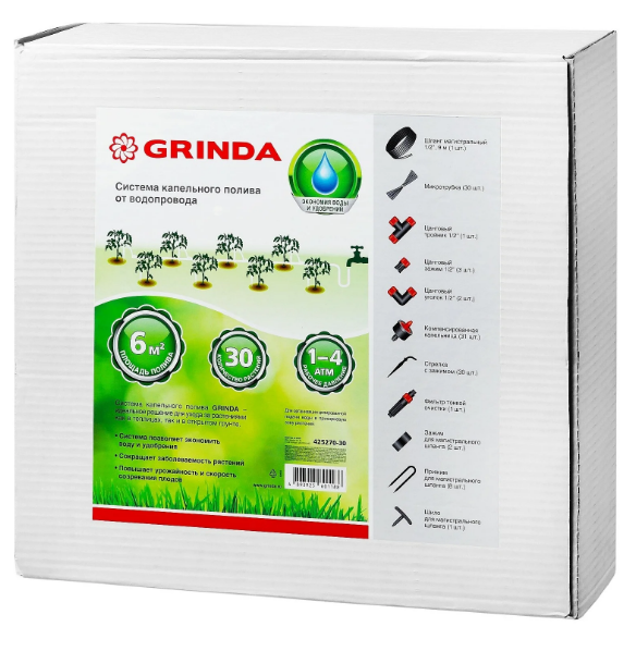 | Комплектация: | шланг магистральный 1/2" 9 м - 1 шт, микротрубка - 30 шт, цанговый тройник 1/2" - 1 шт, цанговый зажим 1/2" - 3 шт, цанговый уголок 1/2" - 2 шт, компенсированная капельница - 31 шт, стрелка с зажимом - 30 шт, фильтр тонкой очистки - 1 шт, зажим для магистрального шланга - 2 шт, прижим для магистрального шланга - 8 шт, шило для магистрального шланга - 1 шт |